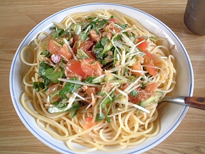 夏場はトマトおいしいんで、暑くてだるい日のお昼ごはんとかにおすすめ。すぐできてツルツルっといけるヨ。