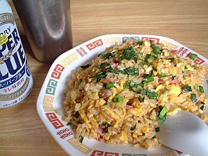 ここんとこしごと忙しくて料理しとらんもんでオリーブオイルが古くなりかけとって、使い切らんともったいないからそれ使ってみた。普通の油の場合はこのぐらいのごはんの量に対しては大さじ1.5がベスト。オリーブオイルでもその量で特に問題なかった。ただ、中華鍋に若干ひっつきやすくなるかな? 炒めてる最中にこそぎ落とす感じにすれば普通に取れるけど。