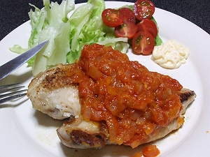 夕ごはんは、トマトソースつくるついでに鶏むね肉のステーキにしたよ。御近所のスーパーで安かったもんで。100グラム58円。
